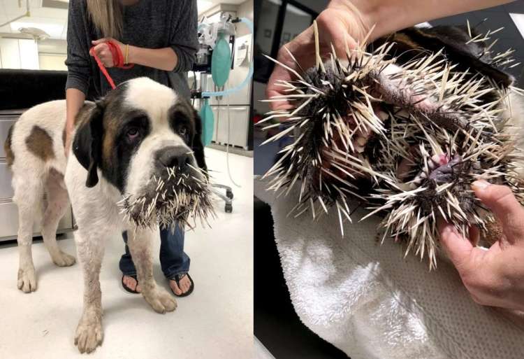 San Bernardo termina con la cara llena de púas al intentar hacerse amigo de un puercoespín